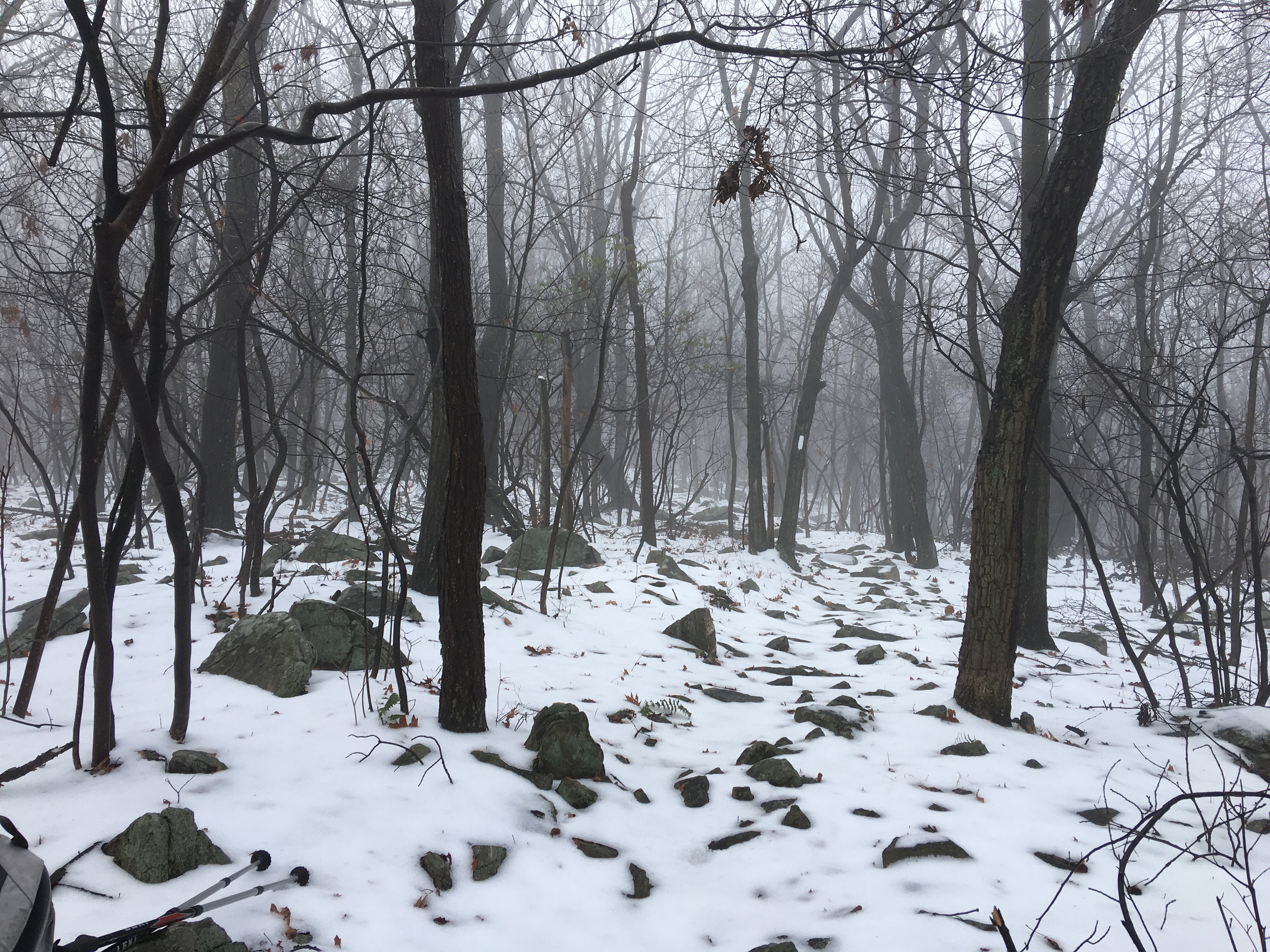 It snowed a few inches up here last night, but the above freezing temperatures had the forest dripping on us for the first few hours. On flat, the walking is easier on this much snow. I felt more sure footed than on wet leaves.