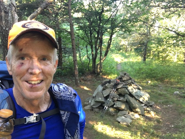 After a strong coffee break on the trail, I was flying up the hills…and came over a rise headed to Calf Mountain Shelter. On the downgrade I got going too fast and whamo. Caught my toe and down I went.